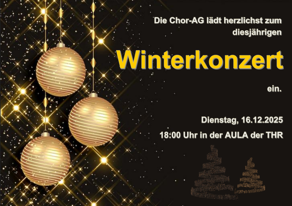 wir laden euch herzlich zu unserem Winterkonzert der Chor-AG ein! Am 16.12.2025 um 18 Uhr präsentieren wir ein abwechslungsreiches Programm mit festlichen Liedern und winterlichen Klängen.